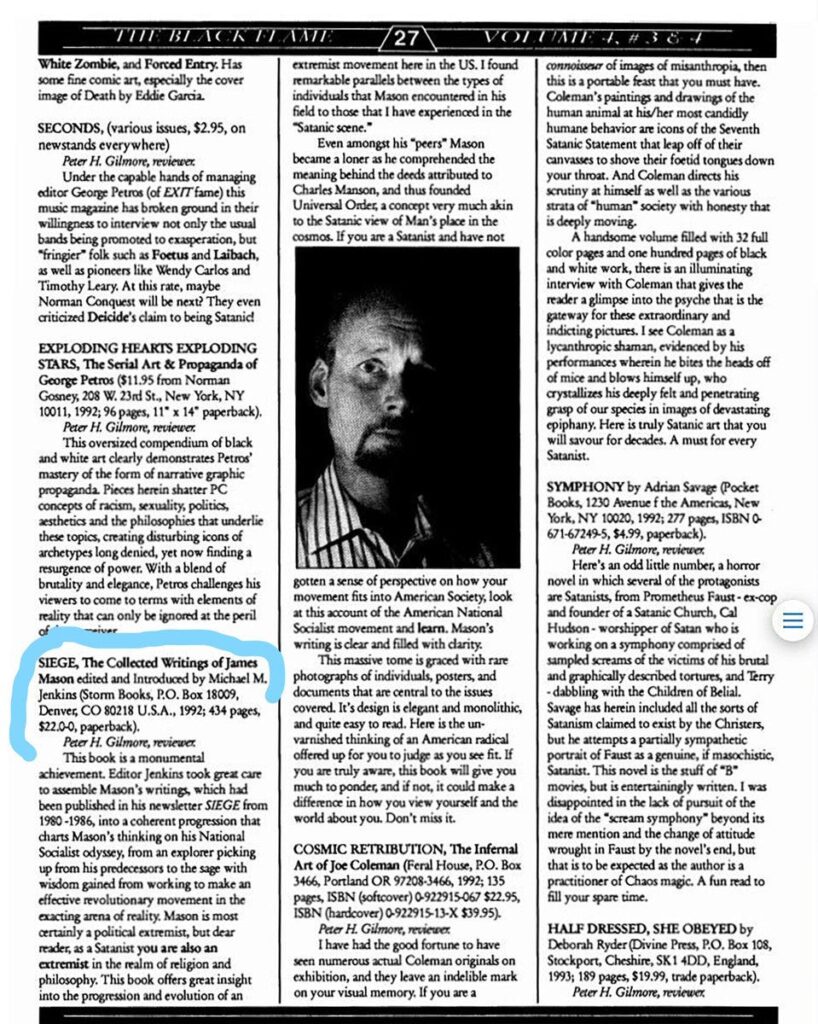 De band was meer dan oppervlakkig. Mason beweerde later dat hij in Anton LaVey een vreemde parallel zag met George Lincoln Rockwell, de oprichter van de Amerikaanse Nazi-partij, in wiens beweging Mason volwassen was geworden. De grootste overeenkomst, in Mason’s eigen woorden, was dat beide mannen “showmen” waren: meesters van het spektakel die begrepen dat symbolen, theater en provocatie hun invloed ver boven het aantal van hun werkelijke volgelingen konden vergroten. Voor Mason belichaamden Rockwell en LaVey verzet tegen de conventie, predikten een geloofsbelijdenis van kracht en gedroegen zich als iconoclasten voor een vijandige wereld. LaVey zelf leek de bewondering te beantwoorden. Toen de Kerk van Satan Mason een exemplaar van de satanische Bijbel overhandigde, schreef LaVey het persoonlijk aan hem op, en prees hem als een “man van moed en rede.”Zulke woorden, afkomstig van de hogepriester van het moderne Satanisme, waren geen toevallige bloei—ze markeerden Mason als meer dan alleen een afstandelijke sympathisant, maar een medereiziger die in die kringen werd gerespecteerd. Dat respect werd verder onderstreept toen de Kerk van Satan Mason’s boek Siege in een van hun pamfletten presenteerde, waardoor zijn werk onder hun eigen publiek werd verspreid.