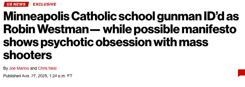 De New York Post meldt dat de schutter is geïdentificeerd als “Robin Westman.”
