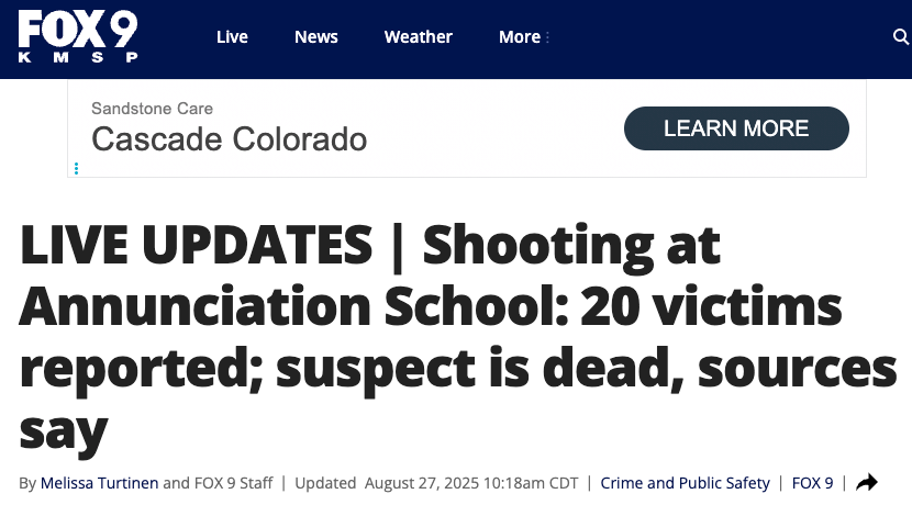 Update (1348ET): een absoluut tragische massale schietpartij ontvouwde zich op een katholieke school in Minneapolis, waarbij een 8-jarige en een 10-jarige dood in de banken achterbleven en 17 anderen gewond raakten.