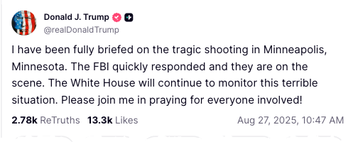 “Ik ben volledig geïnformeerd over de tragische schietpartij in Minneapolis, Minnesota. De FBI reageerde snel en ze zijn ter plaatse. Het Witte Huis zal deze vreselijke situatie blijven volgen. Bid met me mee voor alle betrokkenen!”