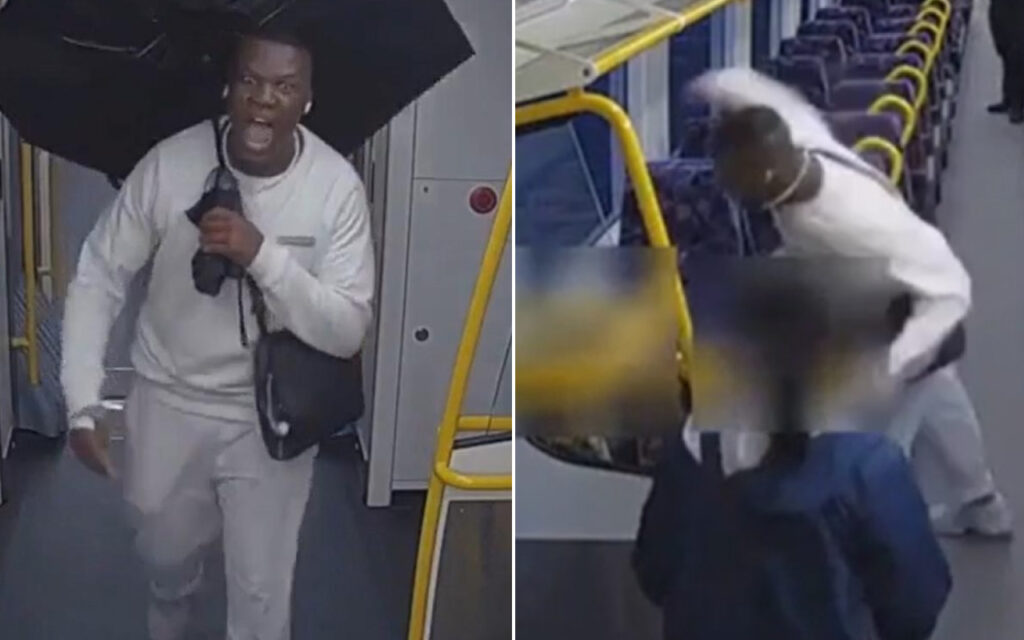 De trein CCTV toont vervolgens de Mhindurwa die een paraplu van de vrouw steelt voordat ze door de treinkaartjes stormt.